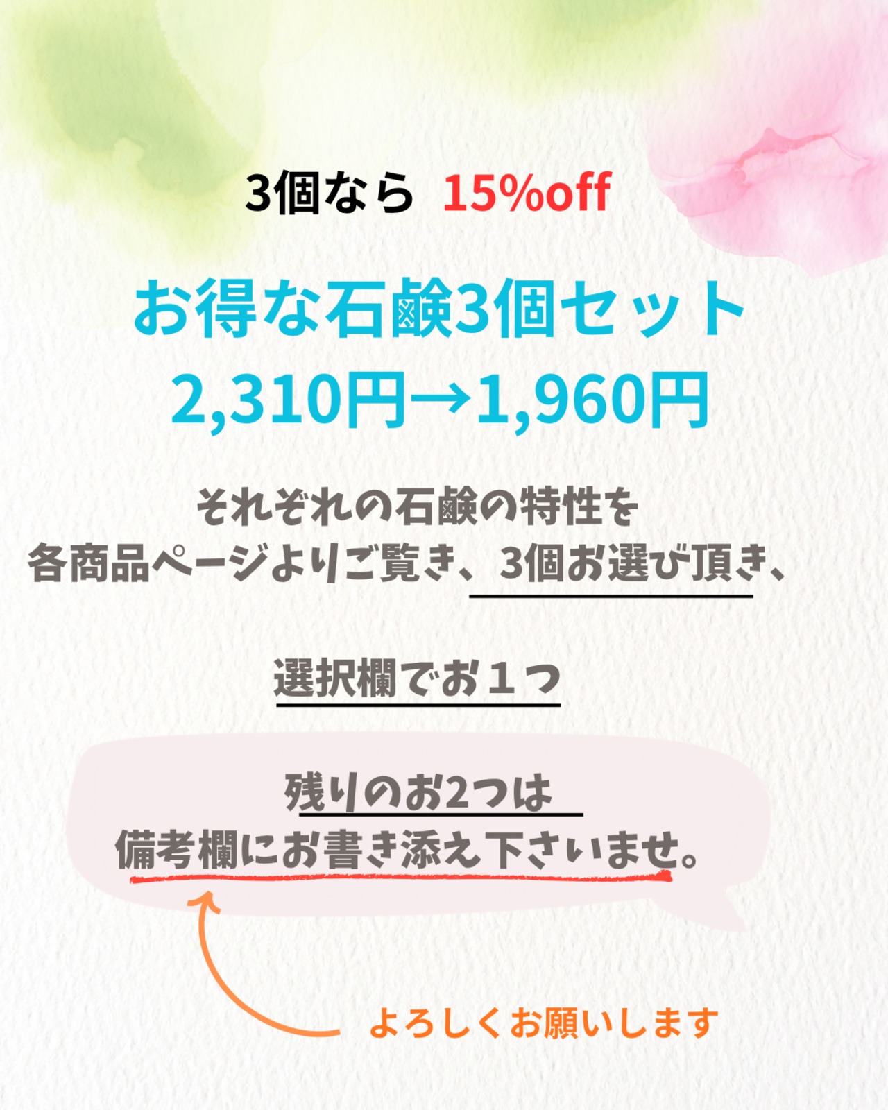それぞれの石鹸の特性を各ページよりご覧頂き、3個お選び頂き、