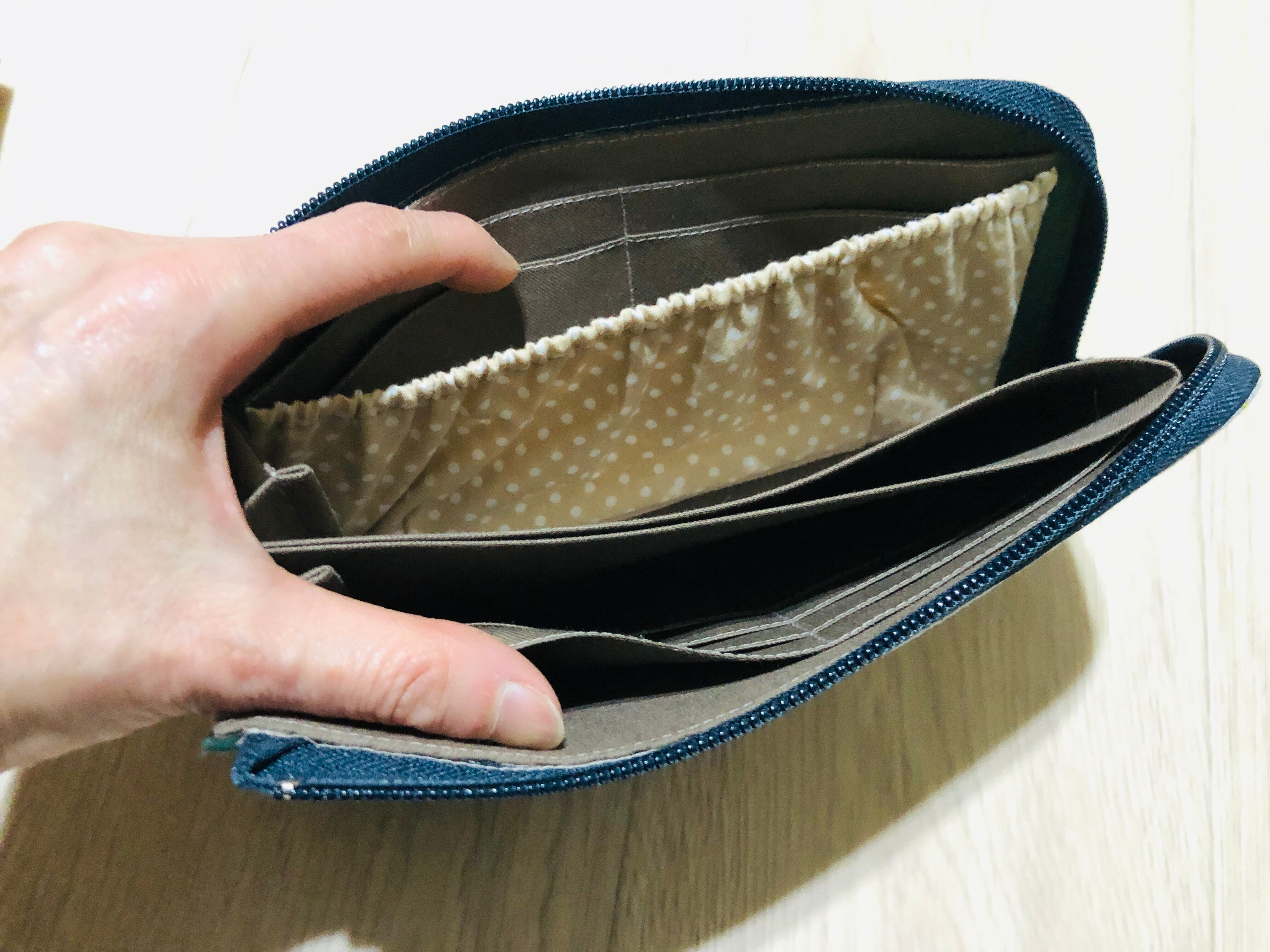 とても軽いです。ゴム付きの内ポケットを付けましたので、通帳と印鑑を入れられます。写真ですので分かりにくいですが、手に取って見て頂けますと納得して頂けると思います。